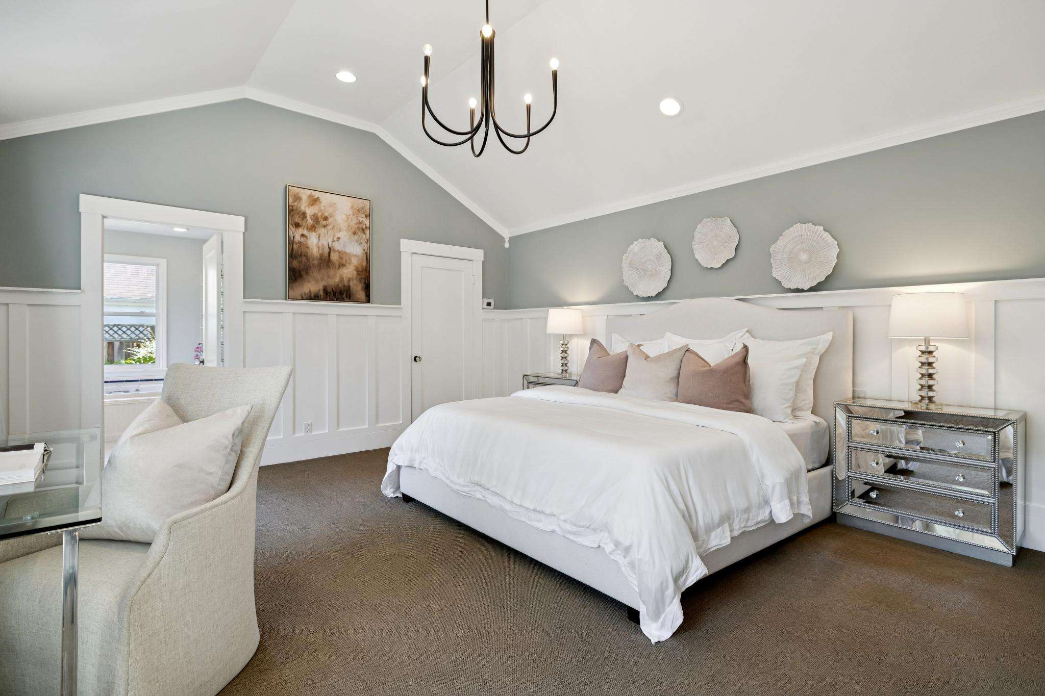 - Primary suite retreat with wainscoting, vaulted ceiling, walk-in closet. Primary bathroom is spacious and sunny, with separate bathtub and shower